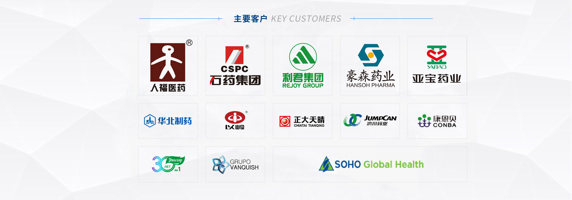 我們的客戶:華藥集團(tuán) | 石藥集團(tuán) | 九州藥業(yè) | 以嶺藥業(yè) | 正大天晴 |武漢人福 | 西安利君 | 山西亞寶 | 濟(jì)川藥業(yè) | 中山達(dá)安基因 | 恒升醫(yī)學(xué) | 九州通 | 康恩貝 |四環(huán)藥業(yè) |豪森藥業(yè) | 哈藥集團(tuán) | 東北制藥 | 武漢麥鑫利